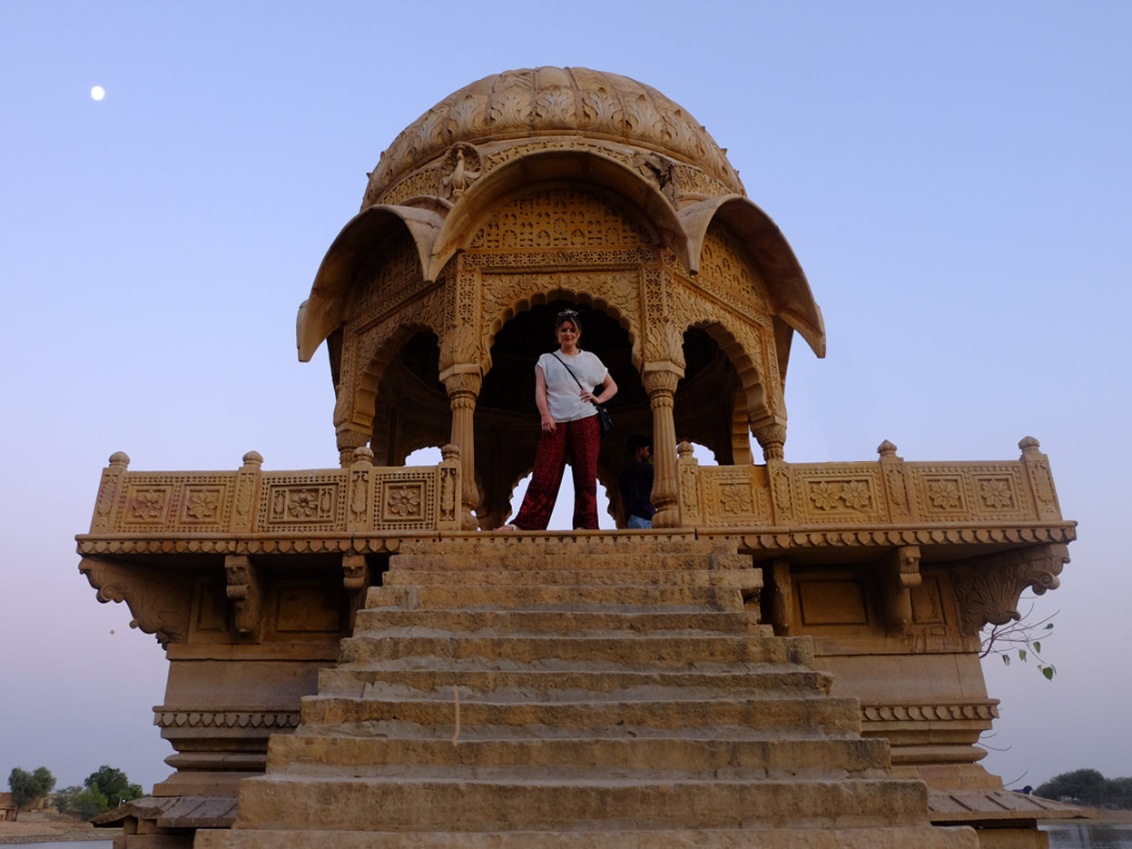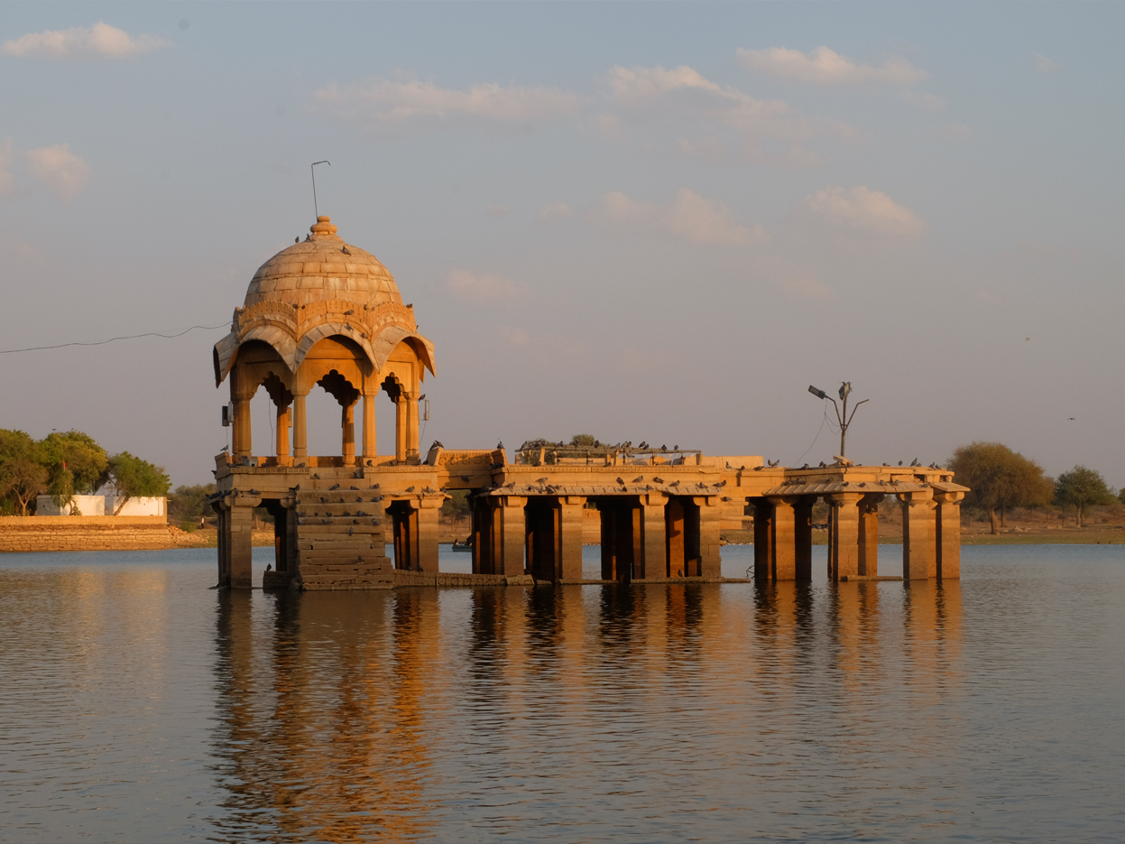 Raggiungiamo così il lago Gadisar, un antico bacino artificiale realizzato per raccogliere le acque monsoniche. La storia narra che in questo luogo un’astuta donna decise di edificare il suo bordello. Al rifiuto della richiesta da parte del Maharaja, la cocciuta imprenditrice decise di attendere l’assenza del sovrano per perpetuare la sua causa, inserendo però nel progetto un piccolo tempio dedicato a Shiva. Al suo ritorno, il reggente non poté così demolire l’impudica costruzione. Per questo motivo oggi sulle sponde del lago sorgono alcuni edifici storici, tra cui due antiche strutture a forma di cupola che emergono dall’acqua, ed ovviamente il tempio dedicato a Shiva. Qui oggi, la gente locale e non molti turisti si radunano ogni sera per assistere al tramonto.