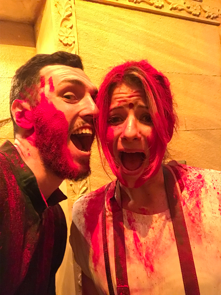 Notiamo lungo la via una numerosa folla e andiamo a curiosare. Tra la gente riconosciamo il motociclista che ci ha dato il passaggio e lui riconosce noi, accogliendoci nella comitiva come se fossimo amici da una vita. Ci spiega che inizia proprio quella sera la celebrazione per l’Holi, la festa dei colori, che durerà per tutta la settimana. Sapevamo che ci saremmo imbattuti nell’Holi, ma non prima del nostro arrivo a Jaipur. Mentre il nostro amico ci spiega notiamo la sua espressione furba, mentre inizia a smucinare nel borsello. Non abbiamo il tempo di capire che siamo già cosparsi di polvere colorata, mentre la comitiva scoppia in una fragorosa risata. Ci dice che sentiva il dovere di battezzarci e noi, dopo aver chiesto della polvere, ricambiamo il favore. Passiamo con loro ancora qualche piacevole momento prima di rincasare e buttarci sotto la doccia per levare di dosso tutto il colore.