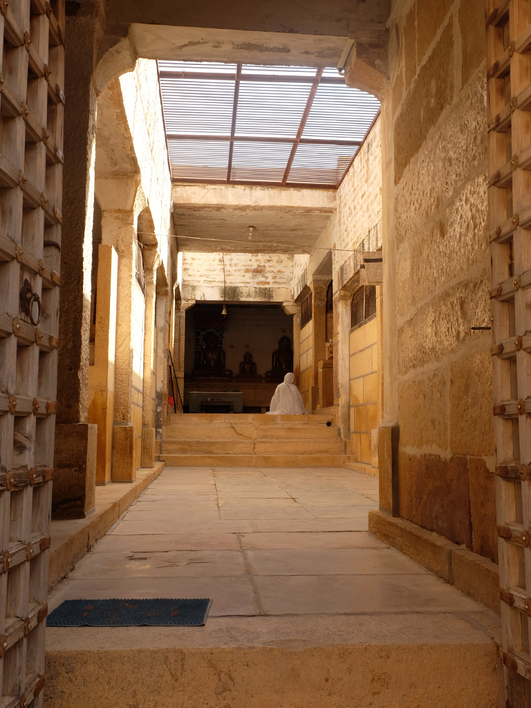 Visitato il palazzo torniamo in strada, impazienti di visitare il resto della città. Dalla piazza centrale si districa in tutte le direzioni il dedalo di viuzze che collega le abitazioni ed i templi della cittadella. Nei vicoli stretti, piccole botteghe di seta e antiquariato si alternano a eleganti Haveli, a ristoranti e piccoli locali. Dopo aver contrattato con alcuni agguerriti commercianti per l’acquisto di qualche souvenir, raggiungiamo il tempio Giainista all’estremità orientale del forte. Qui veniamo informati dai monaci di non poter entrare perché dopo le tre di pomeriggio il Dio dorme e non vuole essere disturbato. Fortunatamente riusciamo a dare una sbirciata da fuori.